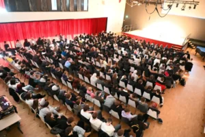 Die Idee zu der Veranstaltung entstand in der GaySB und wurde von Samira und Patrick aus Jahrgang 13 moderiert. Mit knapp 13 anwesenden Klassen aus den Jahrgängen 7, 9, 10, 11 und 12 war das Zeighaus gut gefüllt. Zu Beginn der Veranstaltung fand ein Gedenken an den 5. Jahrestag des rassistischen Anschlags in Hanau statt. In einer bewegenden Geste wurden die Namen der neun Ermordeten vorgelesen #saytheirnames, begleitet von einer Audioeinspielung, die berührende Einblicke in die Leben der Opfer lieferte.