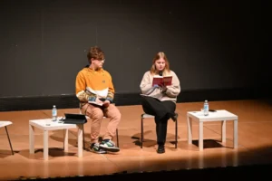 Im Anschluss wurden einige Textstellen aus Semsrotts Buch vorgelesen, bis schließlich der Ehrengast nach einer halben Stunde Verspätung – bedingt durch Bahnprobleme – eintraf. Die beiden Moderator* innen leiteten das Gespräch mit ihm ein, und es entwickelte sich ein spannender Dialog, der durch zahlreiche Fragen aus dem Publikum bereichert wurde. Die rege Beteiligung der Schüler* innen zeigte das große Interesse an den Themen, die Semsrott aufwarf.