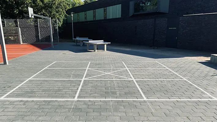 Endlich – am Montag wurde die letzte Linie auf dem neuen Sportfeld gezogen. Jetzt ist der neue Sportbereich auf dem Schulhof zwischen gelbem Haus und dem Zeighaus fertiggestellt. Ein neuer Fußballplatz mit zwei zusätzlichen Basketballkörben, zwei Tischtennisplatten und ein Streetracket-Feld stehen jetzt für die Pause und den Sportunterricht bereit.