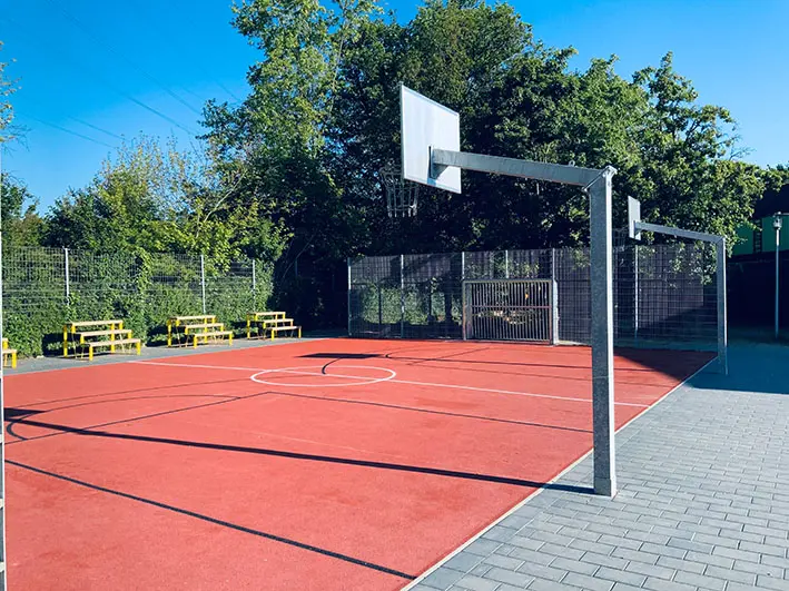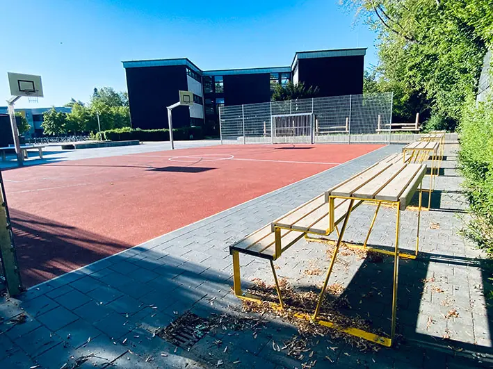 Umringt ist der Bereich von kleinen Tribünen auf der einen Seite, einer Rasenfläche mit Sitzgelegenheiten und einem Beet, welches durch das Science-Profil des Jahrgang 9 angelegt wurde.