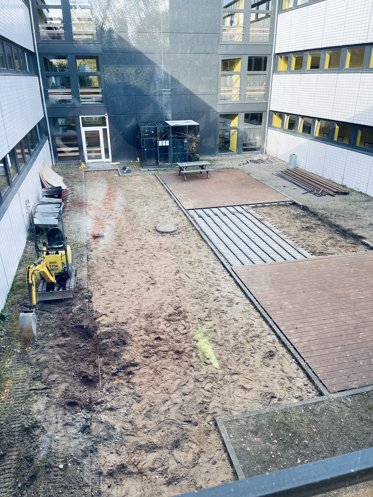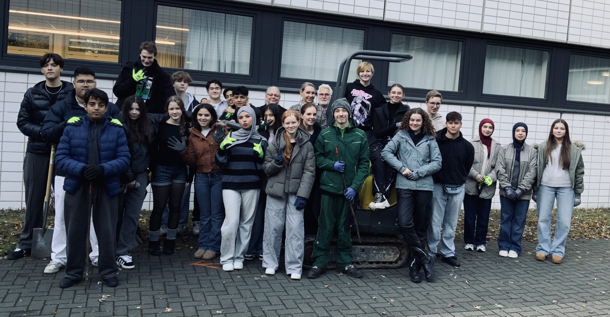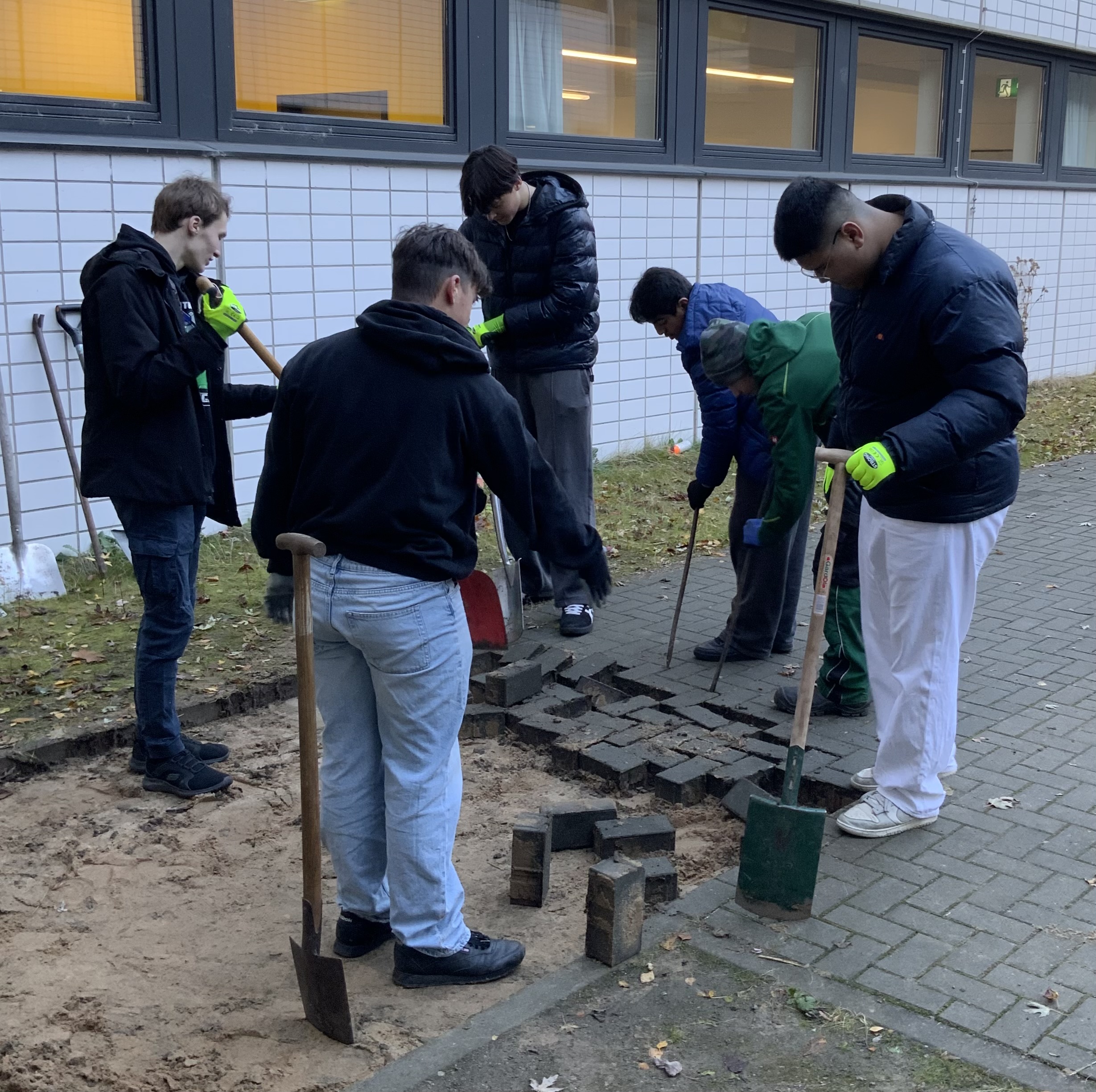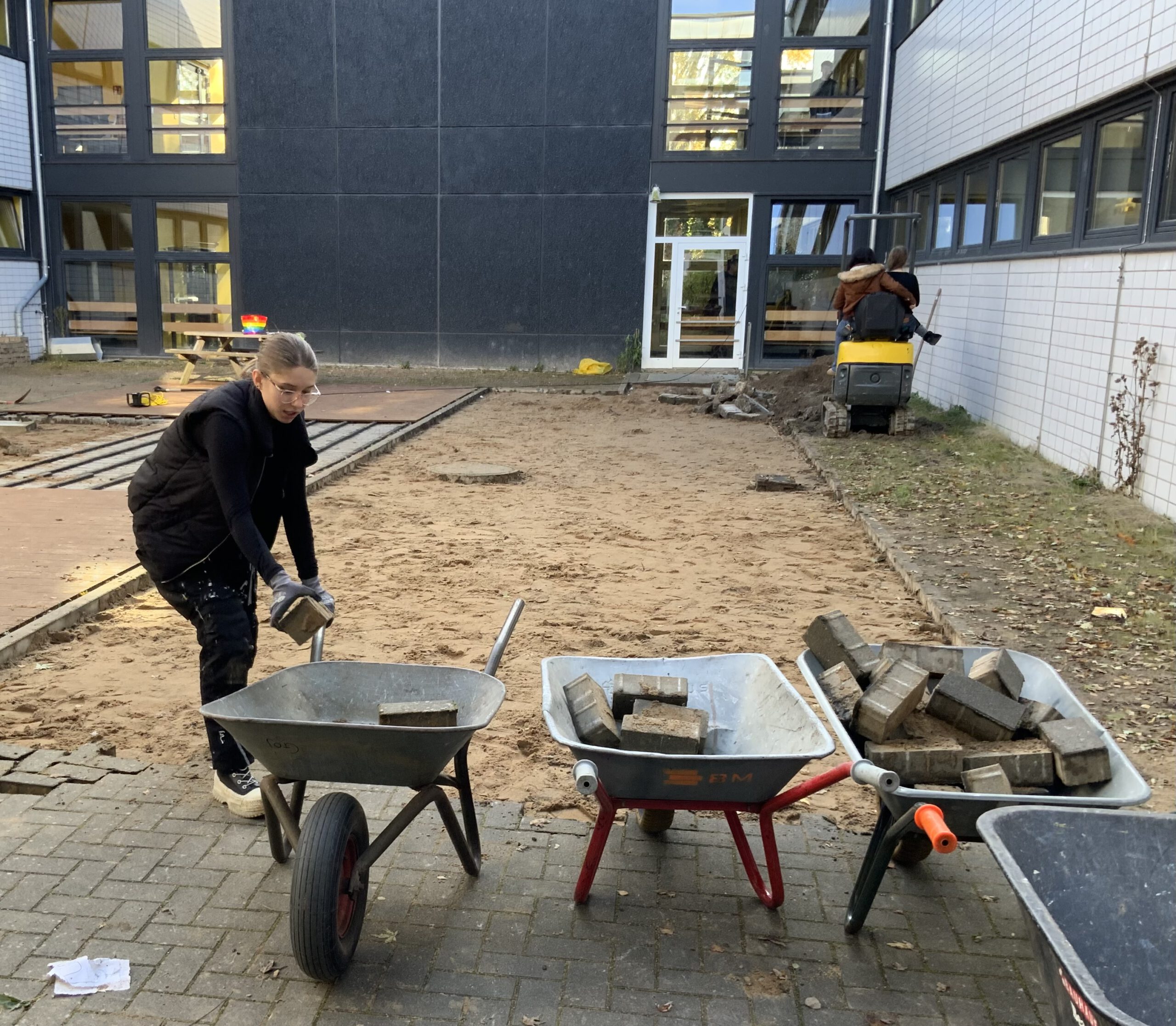 Startschuss zum großen Umbau im Innenhof des gelben Hauses: nach Monaten der Planung und des Rechnens ging es endlich los. In Kooperation mit Schulbau Hamburg und den Firmen BM Abbruch, Knoop und Biotop und mit tatkräftiger Mitarbeit der 10a (Profil „made by GSB“) und ihrer Klassenlehrerin Britta Güttler entsteht bis Februar ein komplett umgestalteter Innenhof des gelben Hauses.