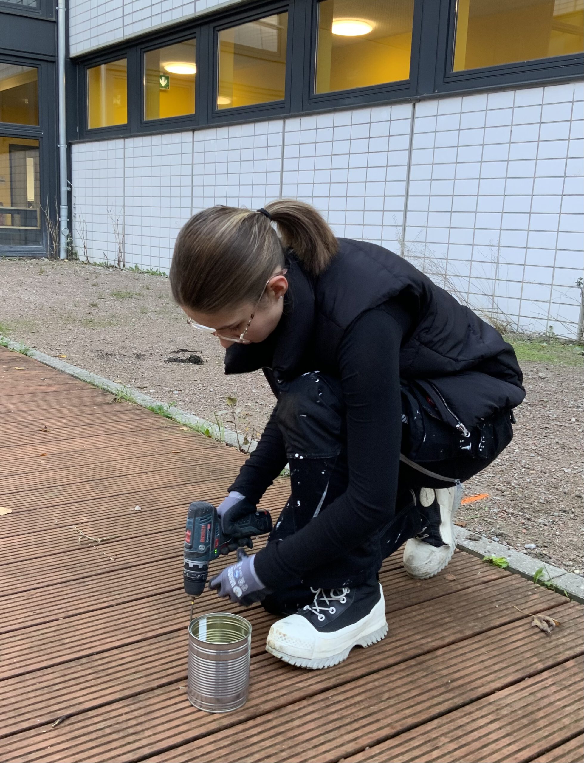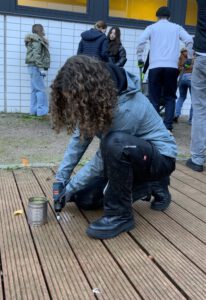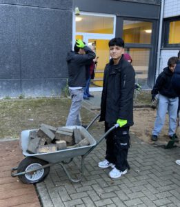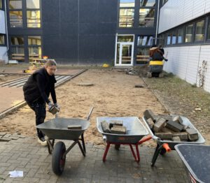 Neben der bereits vorhandenen Voliere entstehen ein naturnaher Streifen mit kleinen Rückzugsräumen, eine Kletterwand und drei Hochbeete für unsere Bistro-Klassen. Im Zentrum der riesigen Terrasse wird ein Pavillon in Fachwerkbauweise Platz für Treffen und Lernen bieten. Insgesamt 70.000 Euro werden für die naturnahe Umgestaltung investiert. In allen drei Bauabschnitten arbeiten die Schüler* innen tatkräftig mit. Schon am ersten Tag konnte das alte Pflaster fast komplett aufgenommen werden!