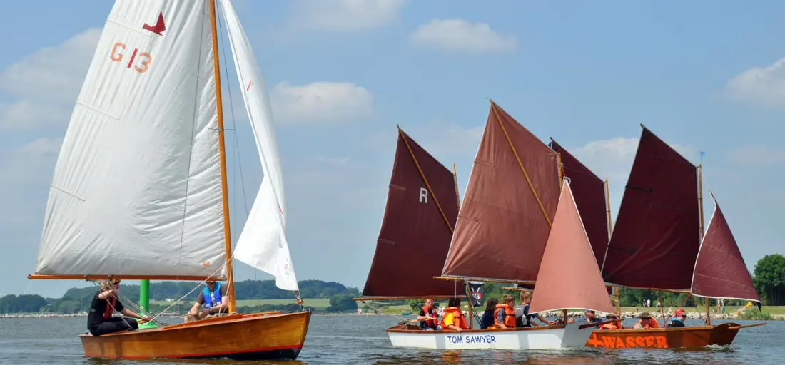 Die jungen Schüler* innen aus den Jahrgängen 5-7 segeln in „Robinson“-Jollen, schönen Jugend-Segelkuttern aus Holz, von denen wir 3 Boote haben. Sie sind super Anfänger-Boote, segeln klasse und können kaum kentern. Ältere Schüler* innen ab Jahrgang 8 segeln in den sportlicheren „Lis“- und „Gruben“-Jollen. Sie, als die erfahrenen Großen, dienen den jüngeren Schüler* innen als Vorbild, ziehen sie mit und bringen ihnen die Kniffe der Segelei bei.