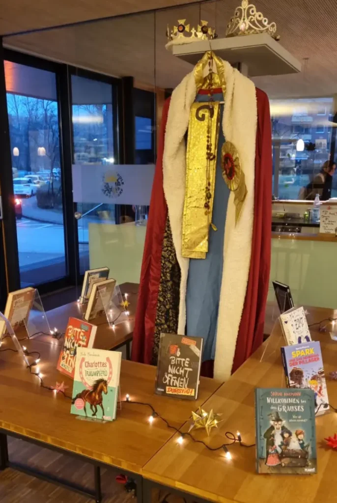 Ende November fand der Vorlesewettbewerb in Jahrgang 6 statt. Zwei Schüler* innen aus jeder Klasse waren ausgewählt worden. Diese kamen dann mit ihrem Buch in die Bibliothek. Da fand der Wettbewerb nämlich statt. Die Bibliothek war richtig schön dekoriert worden. Im Zuschauerraum saßen gespannt auch Mitschüler* innen und Eltern.