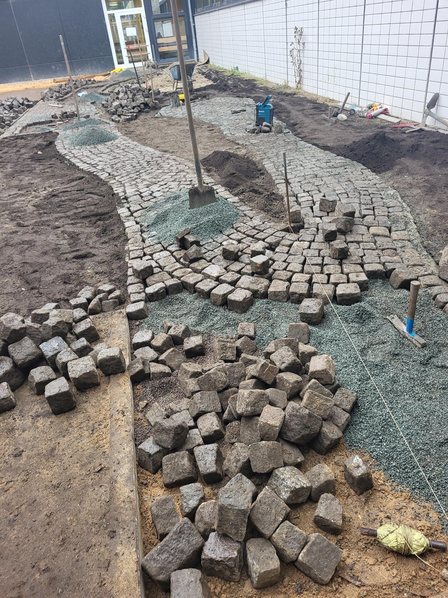 Gemeinsam hatten sie die Idee, den Innenhof zu einem neuen Ort zu gestalten und umzubauen. Seit ungefähr drei Wochen arbeiten sie jetzt schon zusammen und teilweise mit anderen Klassen und Lehrer *innen daran. Bisher schafften sie überschüssigen Sand und Erde raus, machten den Boden frei von Holzplatten und begannen stattdessen dort Steine zu legen.