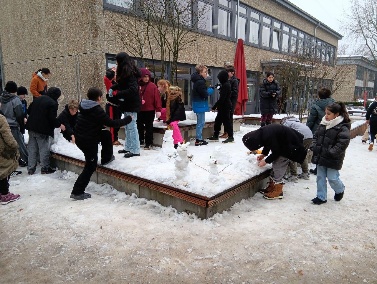 Danach folgte die Schneeburgen Challenge. Trotz kalter Hände wurde draußen eifrig gebaut, geplant und diskutiert. Den Abschluss bildete das Gestalten von Schneefiguren, bei dem die Teams ihrer Fantasie freien Lauf ließen.