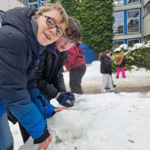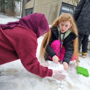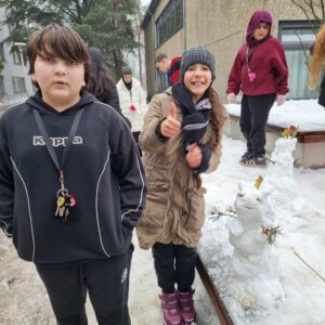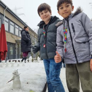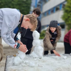 Danach folgte die Schneeburgen Challenge. Trotz kalter Hände wurde draußen eifrig gebaut, geplant und diskutiert. Den Abschluss bildete das Gestalten von Schneefiguren, bei dem die Teams ihrer Fantasie freien Lauf ließen.